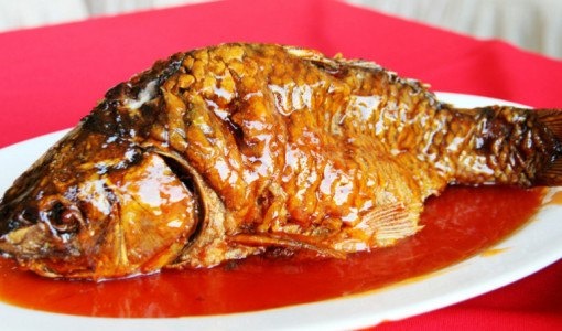 罾蹦鲤鱼 天津早年也算是鱼米之乡,津菜中不乏有很多鱼虾类的美食!罾蹦鲤鱼就是津菜的代表之一!既然是代表必然是有它的独到之处,首先是以带鳞活鲤鱼炸溜而成,炸制后还要保持原有的鱼形,并且鱼形要保持很长时间不塌软,酱汁浇在鱼身上的瞬间会发出清脆的声响。特点是鳞骨酥脆,肉质鲜嫩,大酸大甜。尤其是上桌后趁热浇以滚烫的卤汁时,热气蒸腾,香味四溢,热鱼吸热汁,吱吱声不绝,视觉、听觉、嗅觉、味觉俱佳,格外增添食趣。