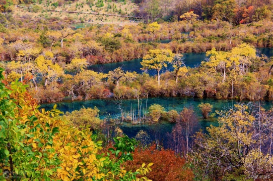 树正群海前后连绵数里,上下高差近百米,由19个大小不同的海子呈梯田状群集而成。在这些大大小小的海子之间,长满了柳、杨、松、杉等乔木以及种类众多的灌木丛。